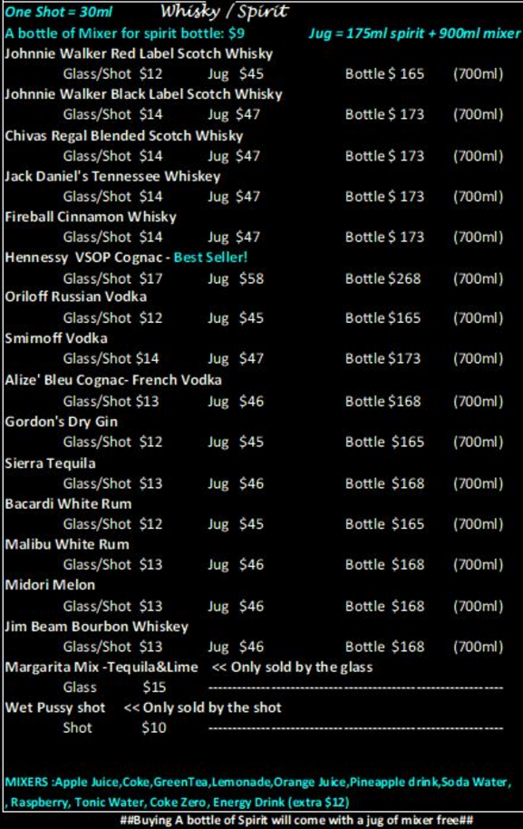 | HAPPY HOUR | 1:00 TO 6:00PM @$10 PER HOUR/PERSON (MIN. 2PAX) *EXCLUDES PUBLIC HOLIDAY* |